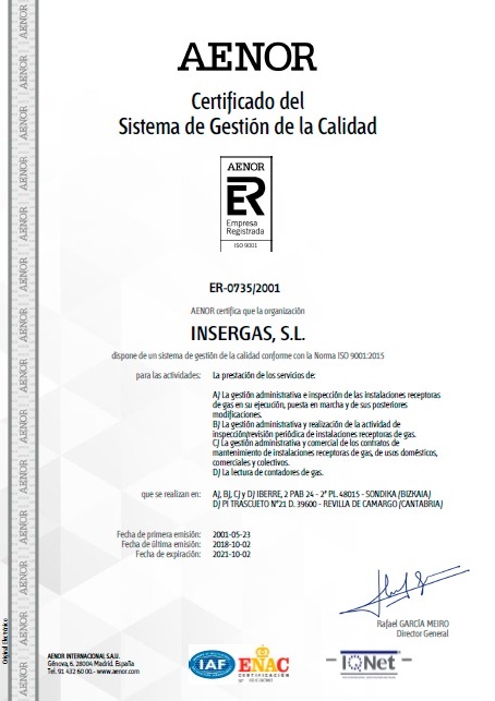 El buen hacer y la plena satisfacción del cliente constituyen el paradigma de INSERGAS, empresa que se esfuerza diariamente por conseguir una mejor continua de la gestión tanto de sus recursos humanos y materiales como de sus procesos. Nuestra Política de Calidad, Medio ambiente y Seguridad y Salud en el Trabajo, está orientada hacia la búsqueda continua de la total satisfacción de los servicios prestados a nuestras partes interesadas, asegurando siempre la seguridad y salud de nuestros trabajadores , así como la protección del medio ambiente.